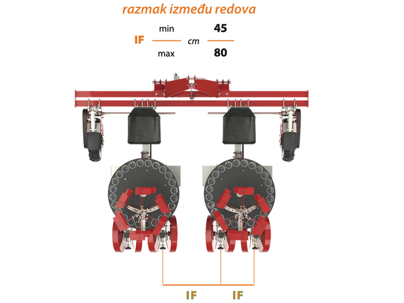 - Rotirajući dozator - sistem za sadnju, okretni, horizontalni sa 24 šalice - čaše, s dnom koje se otvara prilikom sadnje, s uvijek okomitim padom čak i na maksimalnom međurednom razmaku što osigurava preciznu i optimalnu sadnju biljaka.